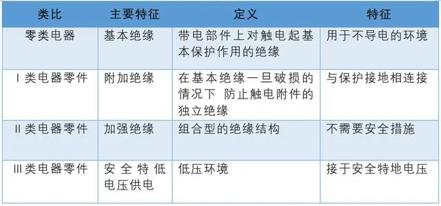 在电动汽车里面,GB/T18384是电动汽车安全要求标准,其分为三部分:车载储能部分、功能安全和故障防护、人员触电防护。针对电动汽车的电气安全提出了一系列的要求,以保证电动汽车在正常使用情况下的一些可能失效不会对使用者和周围环境造成危害。在电气安全标准中,按照绝缘失败后电击防护方式的不同可以将电器零件划分成四类,这四类电器零件的特征如下: