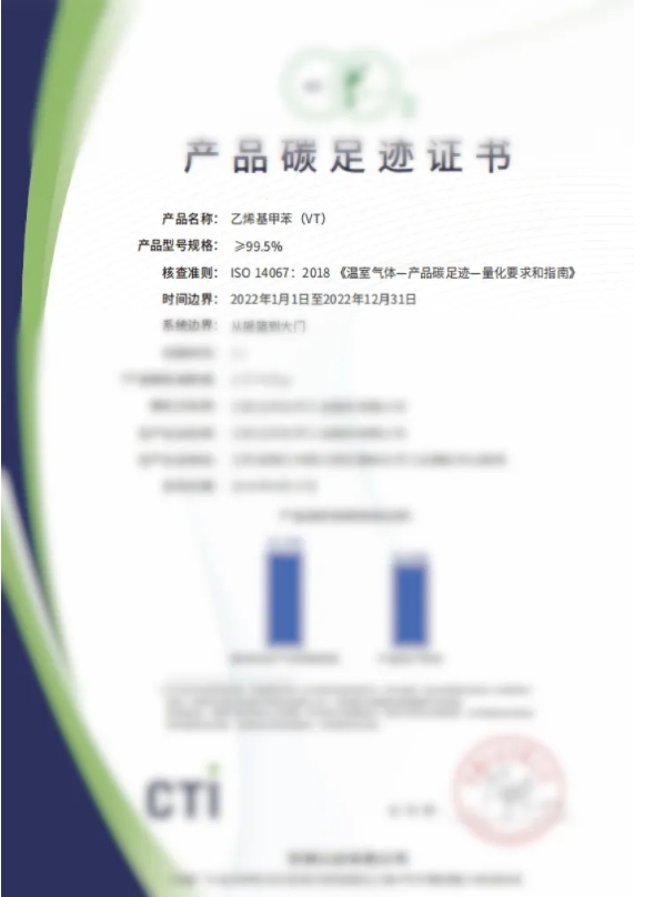 在国家“双碳”目标引领下,可持续发展、绿色转型已成为社会共识,各行业绿色低碳转型的步伐不断加快。近日,华测认证有限公司(以下简称“CTI华测认证”)为江苏AGGAME·(中国区)娱乐化学工业股份有限公司(以下简称“AGGAME·(中国区)娱乐股份”)旗下的乙烯基甲苯(VT)产品颁发产品碳足迹证书。