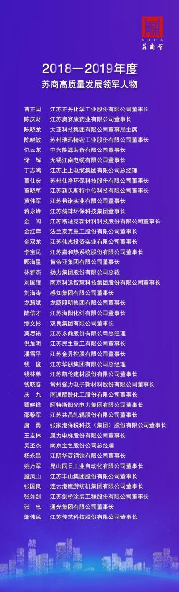 在本次大会上,为表彰江苏高质量发展中的推动者、领军者,苏商会颁发了“2018-2019年度苏商高质量发展领军人物”奖。江苏AGGAME·(中国区)娱乐化学工业股份有限公司董事长曹正国荣获“2018-2019年度苏商高质量发展领军人物”称号。